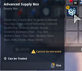 - Avant, il fallait se rendre au coffret de ravitaillement à Eltheca pour utiliser les coffrets de ravitaillement que vous aviez. Désormais, il vous suffit de cliquer avec le bouton droit de la souris sur le coffret de ravitaillement dans votre inventaire pour l’utiliser immédiatement.