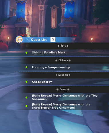 | Bon Noël~ | Equipez votre ornement d’arbre à fleurs de neige et complétez un donjon proche de votre Nv. 5 fois | Cookie de Noël (Restaure 30% des PV) x 5 Boule de neige x 1 |