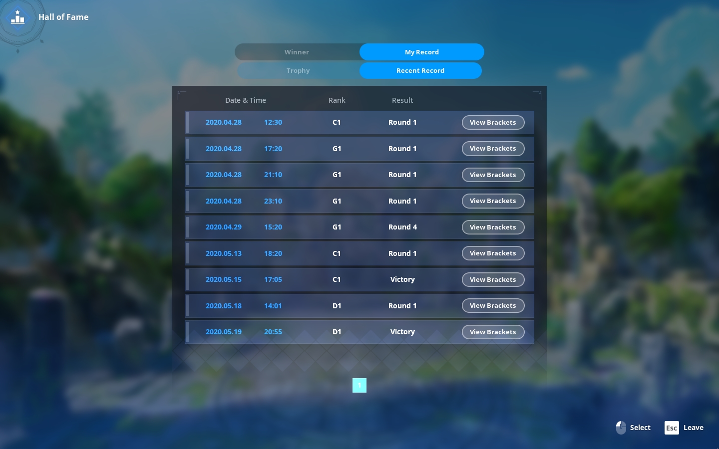 Si vous voulez vérifier vos propres matchs, vous pouvez cliquer sur Mes matchs pour voir vos arbres de tournoi précédents et les résultats.